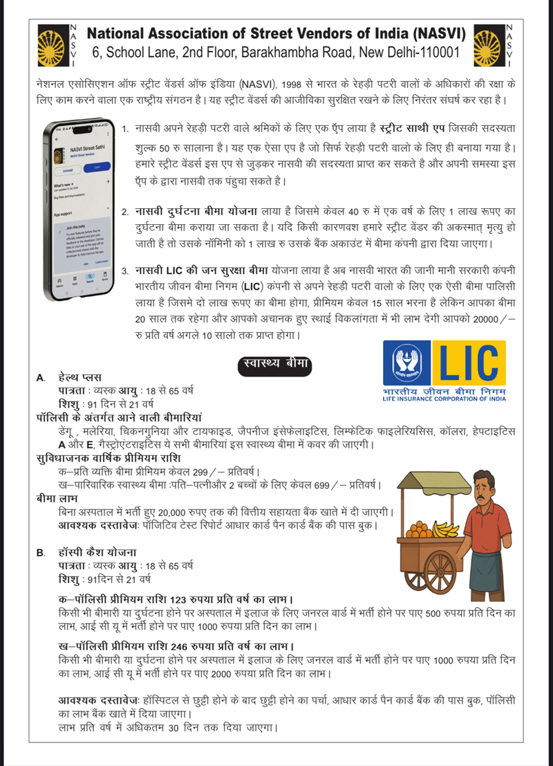 NASVI provides an Accident Insurance Scheme for street vendors at an extremely affordable cost. By paying just ₹40 per year, a vendor is covered with ₹1 lakh accident insurance for one year.
